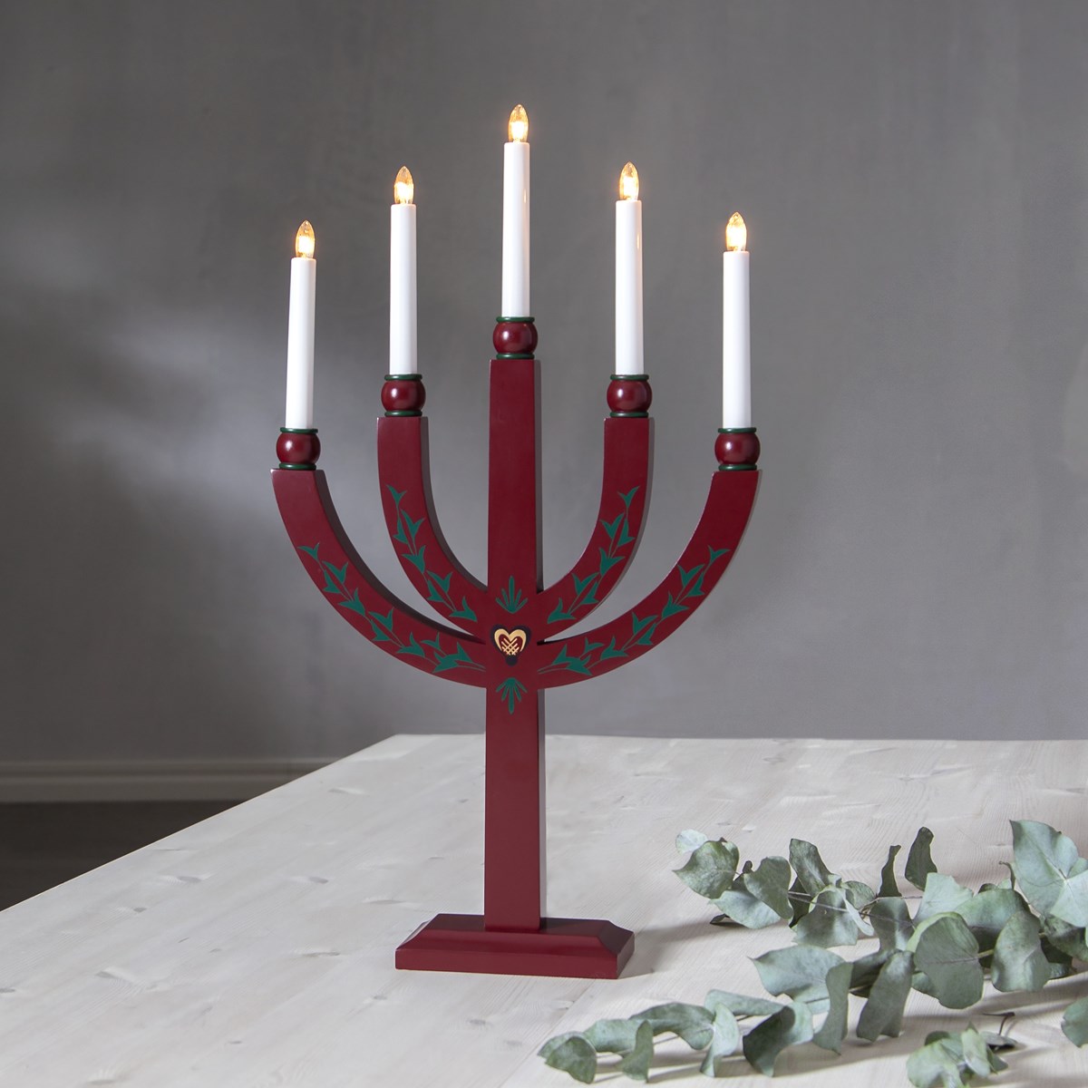 Traditionell träljusstake med fina detaljer. Adventsljusstaken har 5 ljuskällor som ger ljusstaken en mysig belysning och en hemtrevlig julkänsla. Placera i fönstret eller på en skänk. BxH: 35x61 cm.