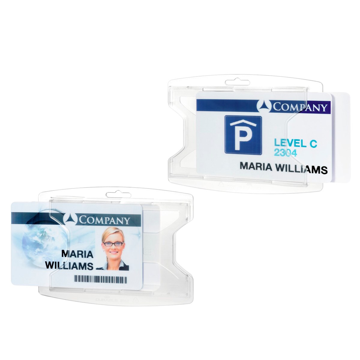 Ett bra val för en organisation som vill minska sin miljöpåverkan! Denna korthållare av 70% återvunnen polypropylen har en täckt framsida som skyddar kortet och en materialbesparande baksida. Tumgrepp gör det lätt att ta ut korten. Tåligt material som som klarar daglig användning utan att hållaren spricker. Kombinera med nyckelband, jojo eller clips. Kan användas i liggande eller stående format. För standardkort ca 54x85 mm.