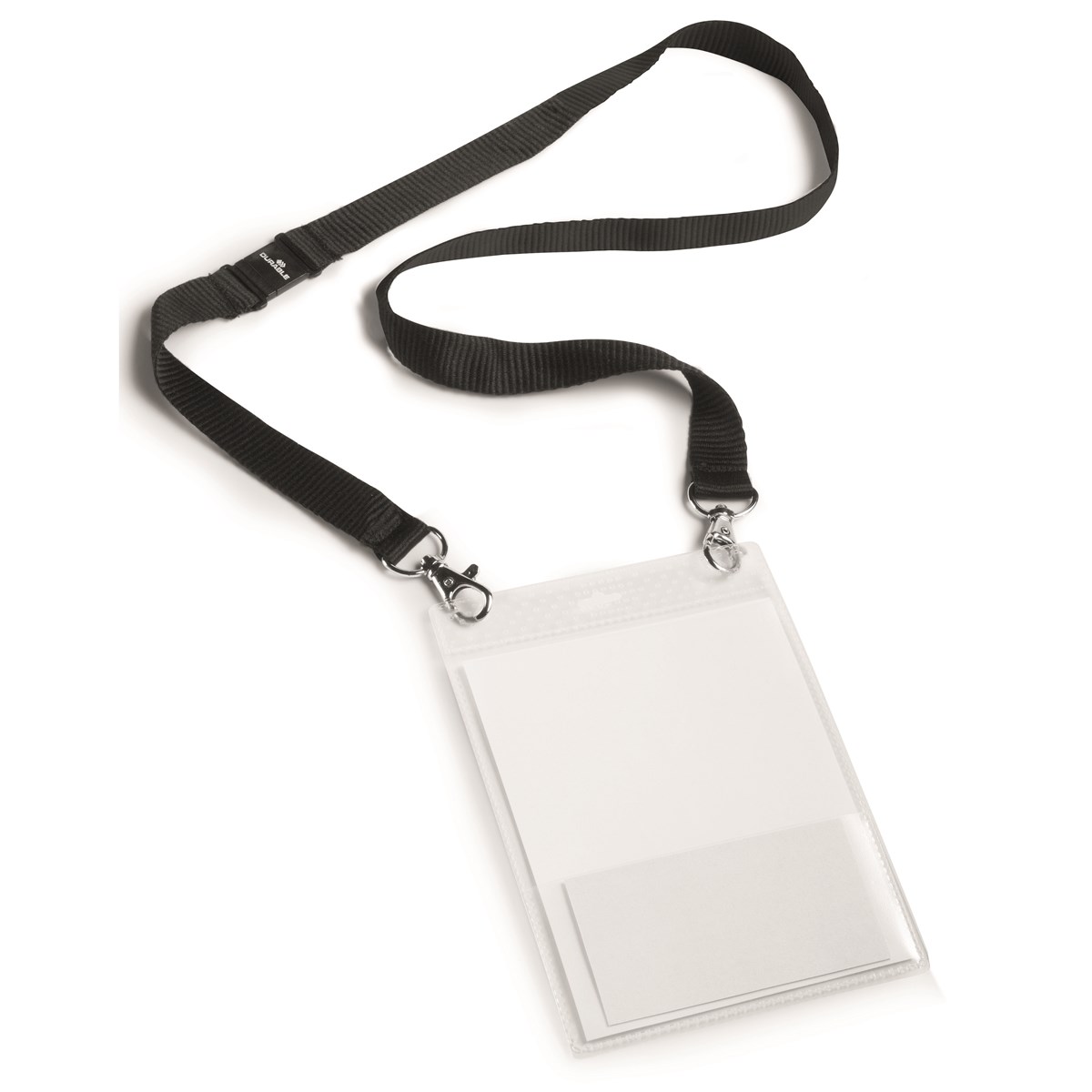 Namnskyltsficka i A6-format som öppnas upptill. En extra ficka för visitkort på ena sidan. Levereras med ett 88 cm långt textilhalsband och säkerhetsspänne. Dubbla karbinhakar gör att skylten alltid hänger rakt ner utan att vrida sig. 10 st/förp.