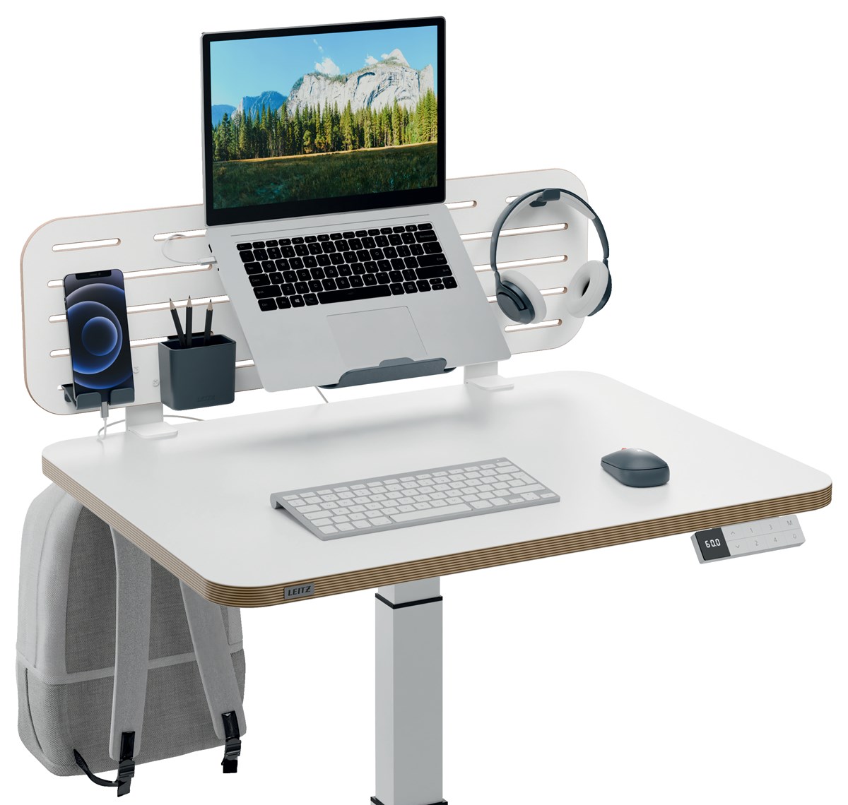 Vertikal förvaringstavla med laptophållare Laptophållaren upp till 15" bärbar dator, maxdjup på 245 mm Fyra skrivbordstillbehör ingår tillverkade av 85 % återvunnen plast Bordstjocklek på max 35 mm Modern och minimalistisk design