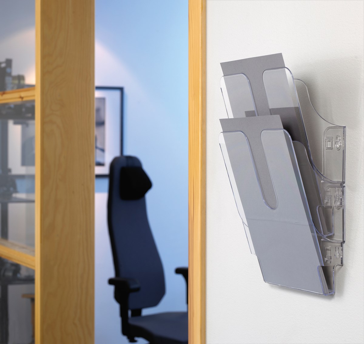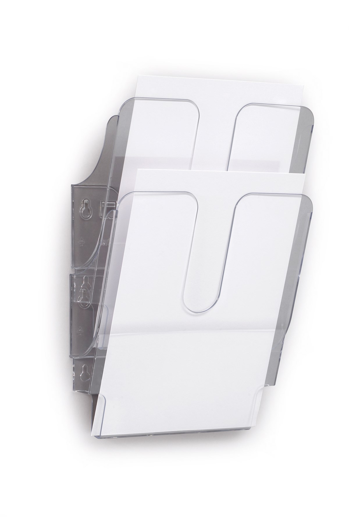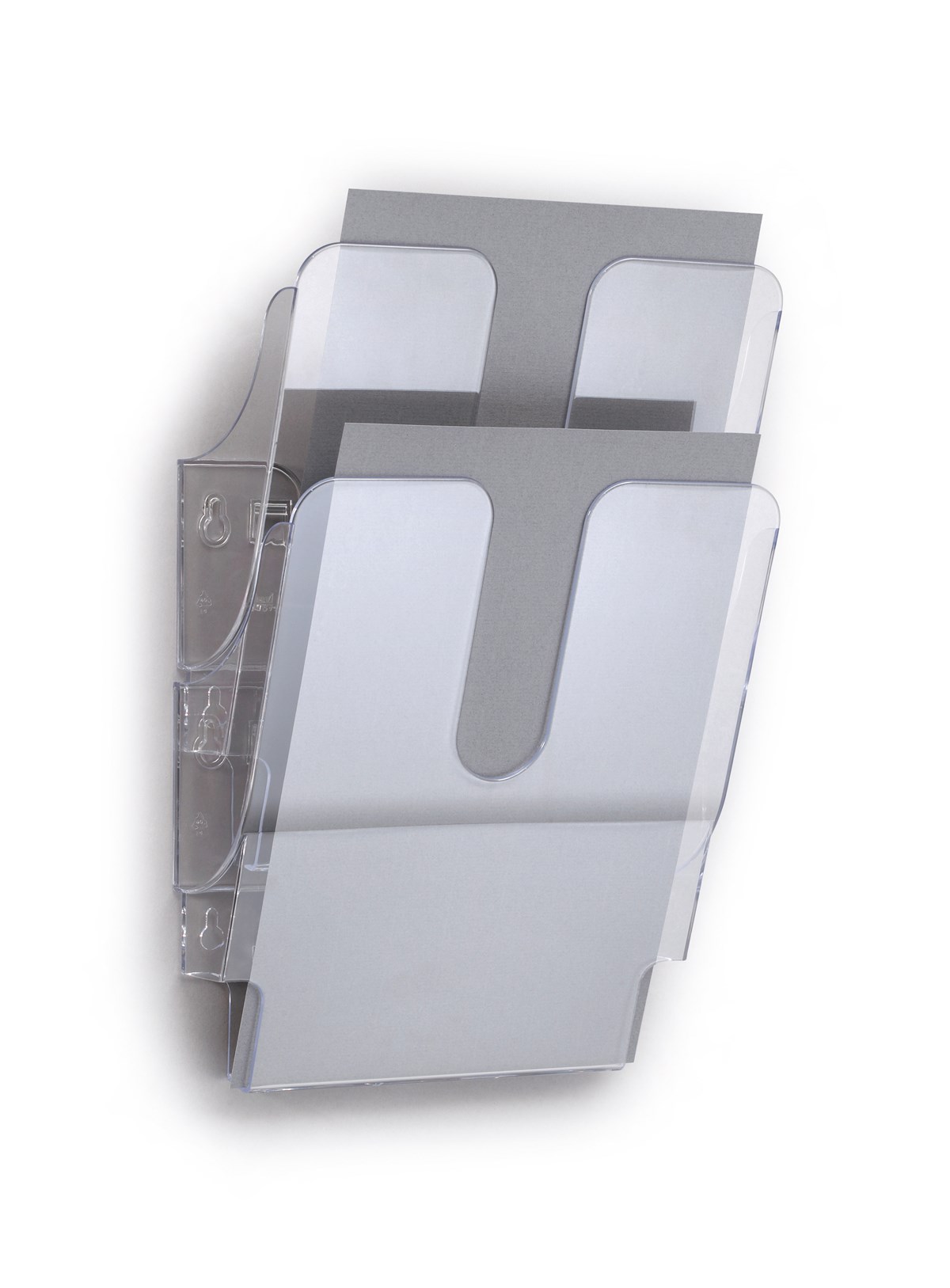 Blankettfack, broschyrställ, postfack - FLEXIPLUS är en serie med platsbesparande, flexibla och väggmonterade hållare för broschyrer, tidskrifter, blanketter och annan information i A4-format. Varje fack har en kapacitet på 24 mm tjocka buntar. Detta är ett komplett set med 2 fack i stående format där facken kan monteras ihop eller användas var för sig.