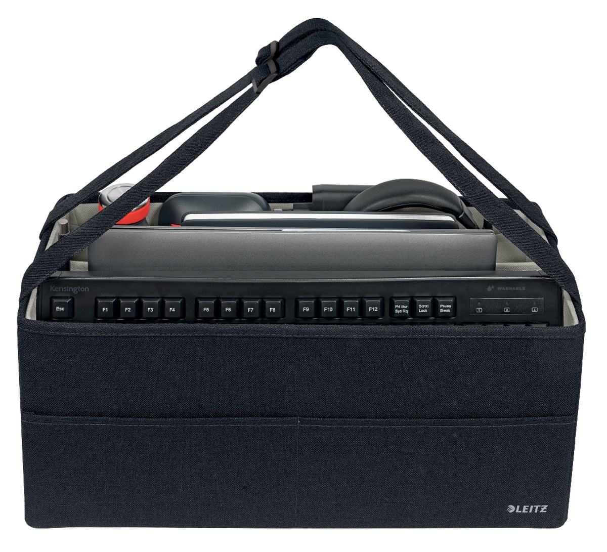 Leitz Office-In-A-Bag-väska i tyg har tre separata fack där du kan förvara och bära med dig allt du behöver för dagen du har framför dig. En modern och praktisk förvaringsväska som har tillräckligt med utrymme för laptop, tangentbord, mus, laddare, headset, anteckningsbok och en vattenflaska. Den får plats i alla skåp i standardstorlek och passar också utmärkt som lärarväska. Tillverkad av mjukt material som är förstärkt med återvunnen kartong för styrka och hållbarhet. Totalt 57% återvunnet material. Namnetiketten som medföljer väskan gör att du enkelt kan identifiera den i delade utrymmen.