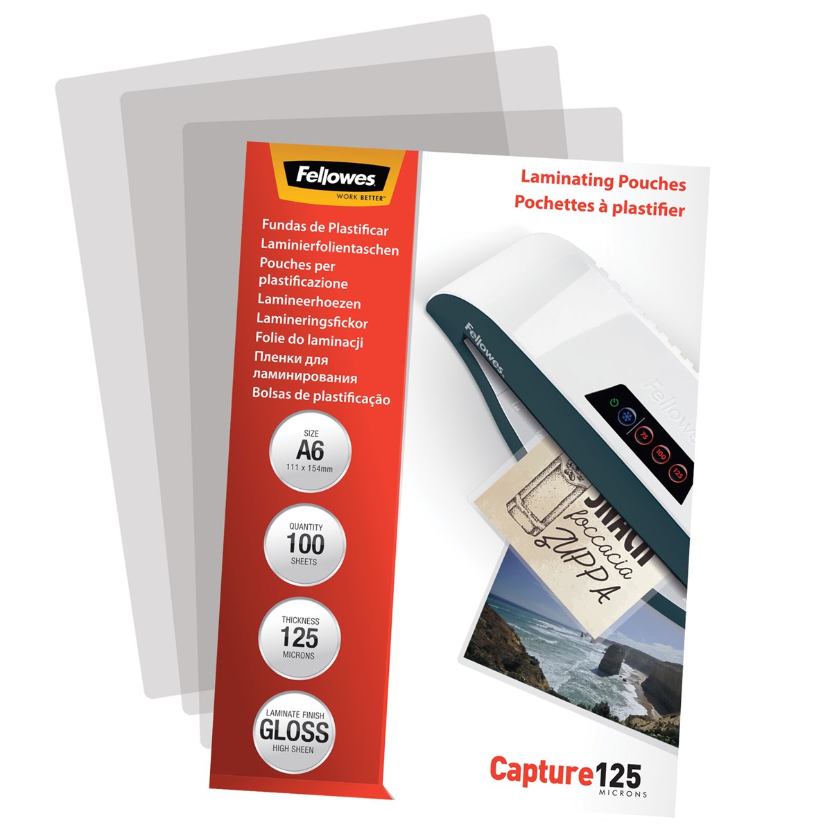 Premium Lamineringsfickor Fellowes med blank yta. Pilar visar åt vilket håll fickan ska vända - dessa försvinner när arket lamineras. Med en tjocklek på 125 mikron erbjuder dessa fickor en hög nivå av dokumentskydd. Kan användas till alla lamineringsmaskiner oavsett märke.