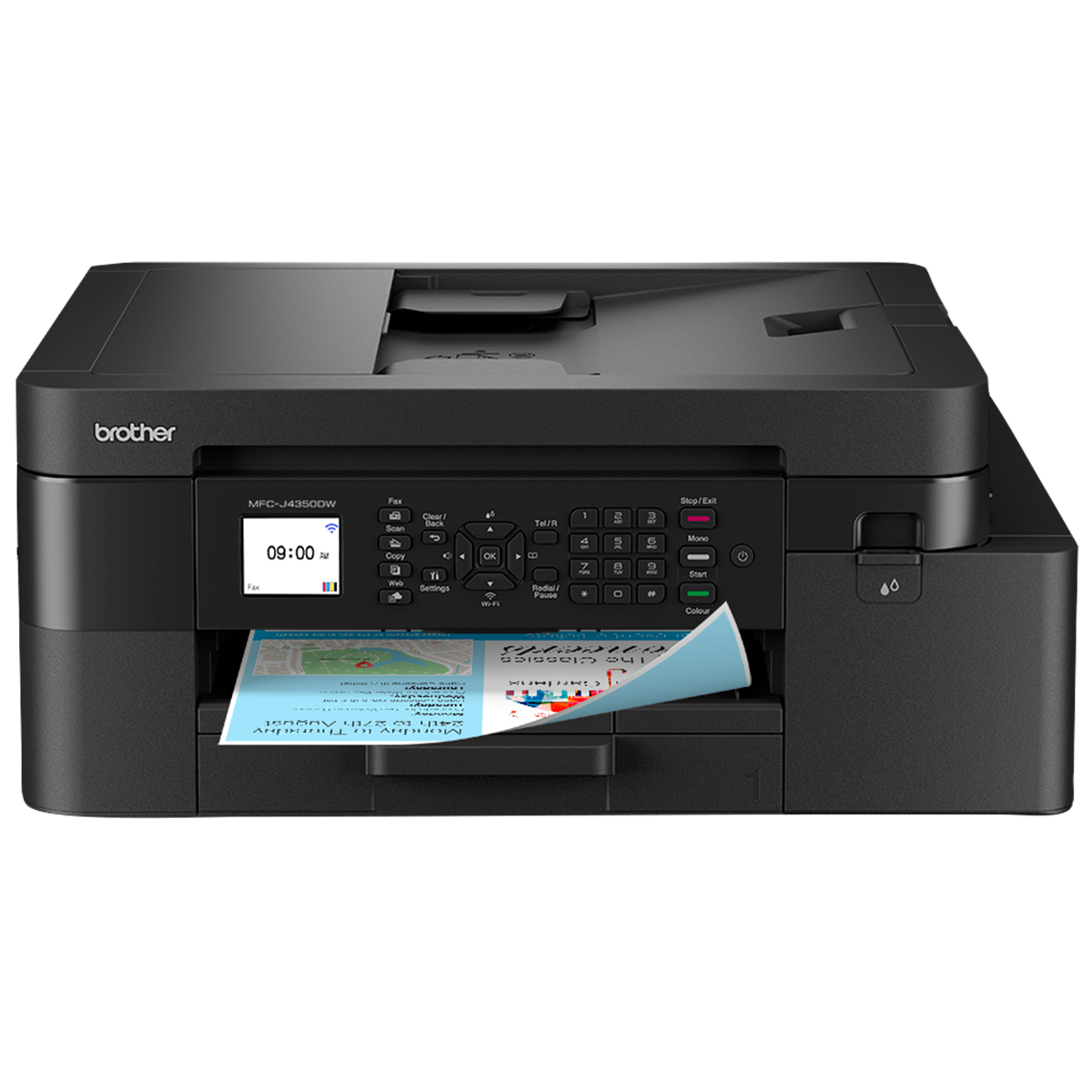 Enkel att använda via Brother Mobile Connect-appen och trygg med inbyggda säkerhetsfunktioner. Levereras med bläck för 350 sidor svart och 350 färg.