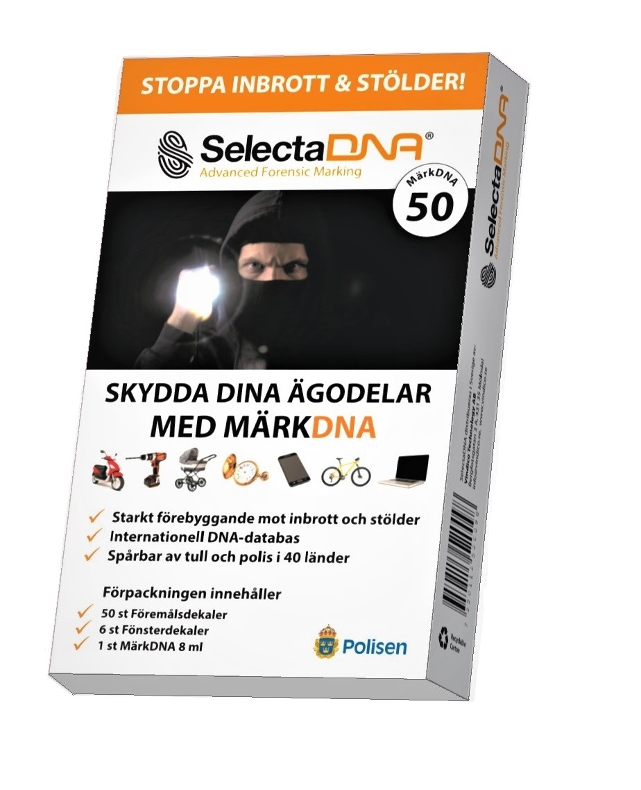 Stöldskyddsmärkning i form av en osynlig vätska som penslas på stöldbegärliga föremål. Varje produkt innehåller en unik DNA-kod och UV-fluorescens som gör det möjligt för polis att identifiera stöldgods och återlämna det till sin rätta ägare. Den unika DNA-koden registreras i ett internationellt register. Innehåll: märkvätska inkl. applikator, fönsterdekaler, objektsdekaler och svensk manual.