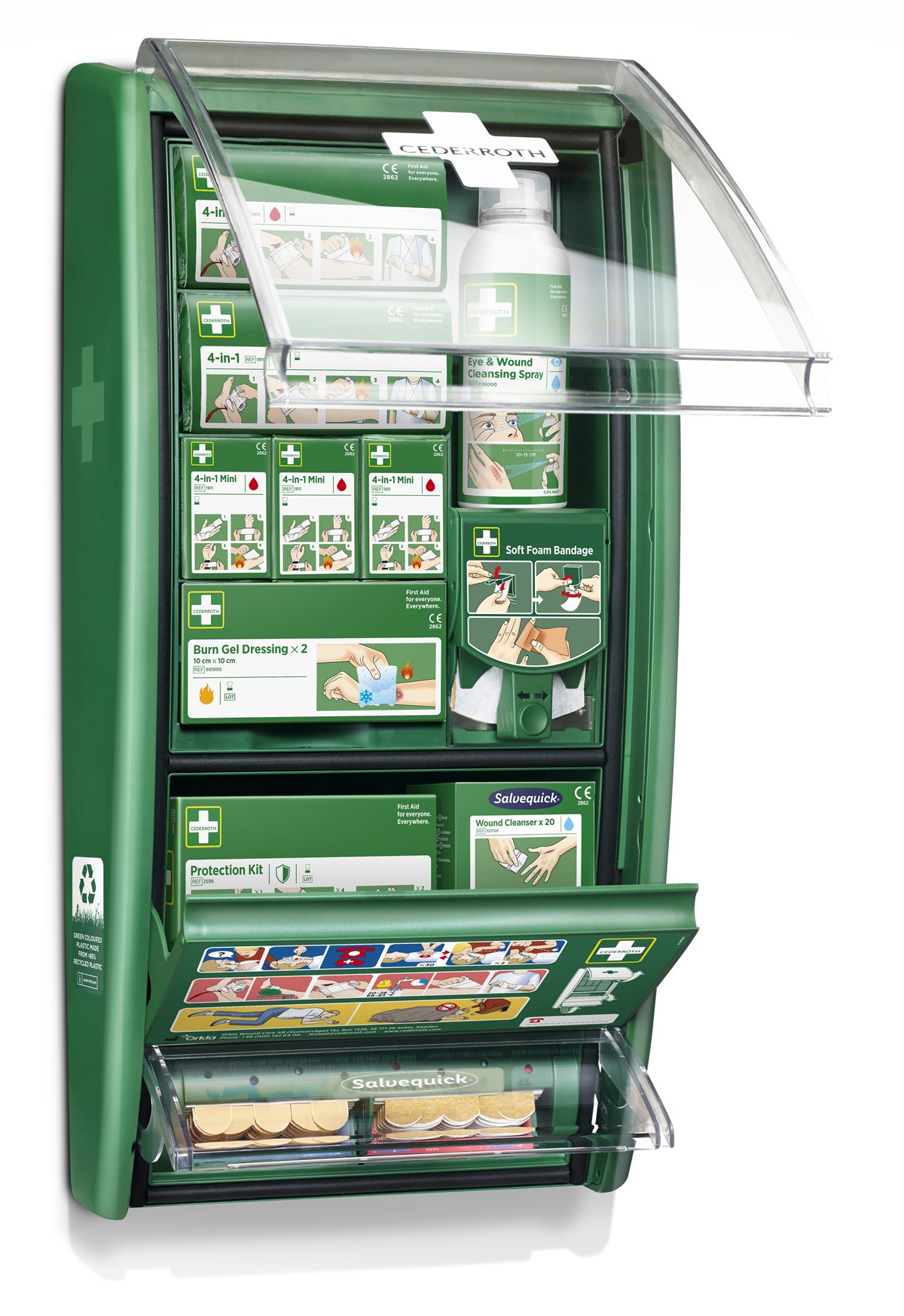 Den transparenta luckan skyddar mot damm och smuts och gör det enkelt att se när det är dags att fylla på produkter. Den grönfärgade plasten i stationen är gjord av >85% återvunnen plast. Mått: 558 x 286 x 117 mm.