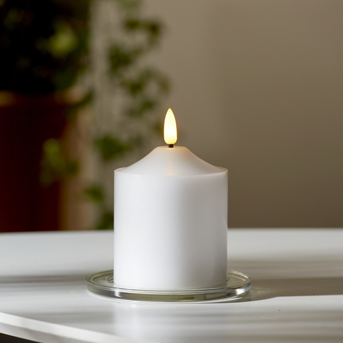 Vaxljus med naturtrogen låga som lyser upp med varmvitt sken. Ljuset har inbyggd timer. Drivs med 2 st AA-batterier (ingår ej). Livstid ca 200 timmar.
