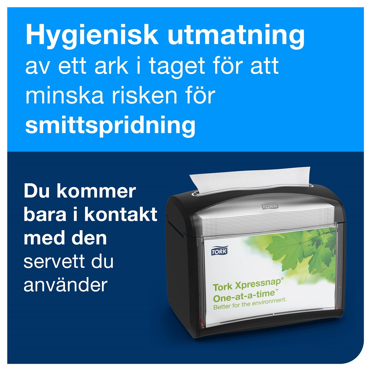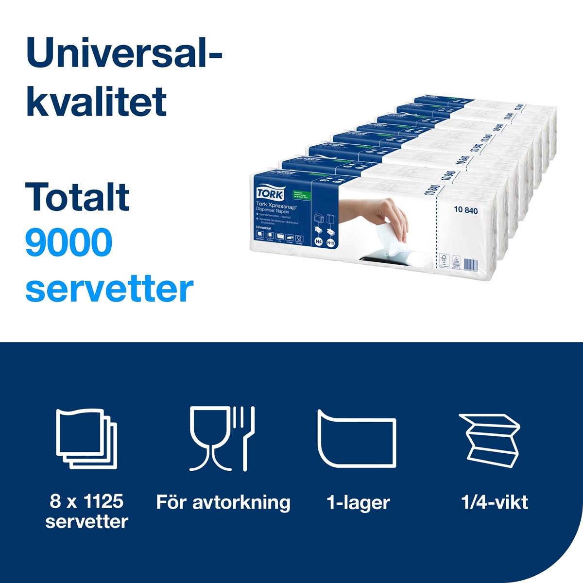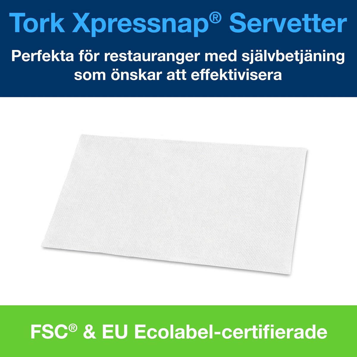 1-lagers servetter som är större som ovikta Unik förpackning som skyddar servettbuntarna vid förvaring och hantering Kontrollera förbrukning och kostnader med utmatning av en servett i taget Kan användas med Tork N4 Xpressnap dispensrar för servetter