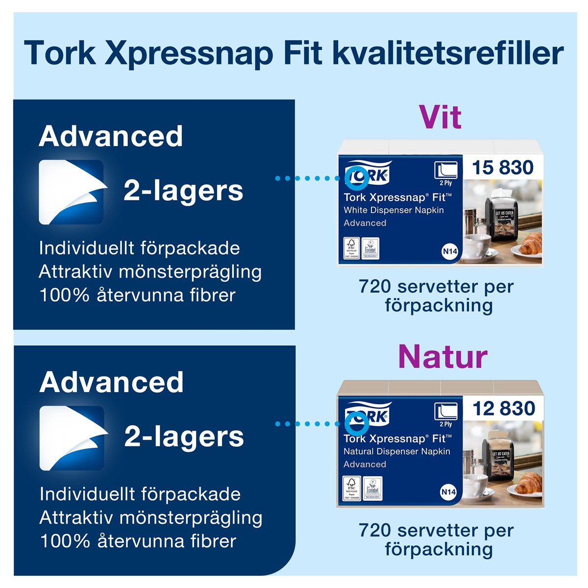 Kompakt dispenser som rymmer fullstora servetter och tar liten plats på bordet Refillindikatorn visar när det är dags att fylla på dispensern Den kompakta refillförpackningen minskar behovet av lagerutrymme Reklamfönster