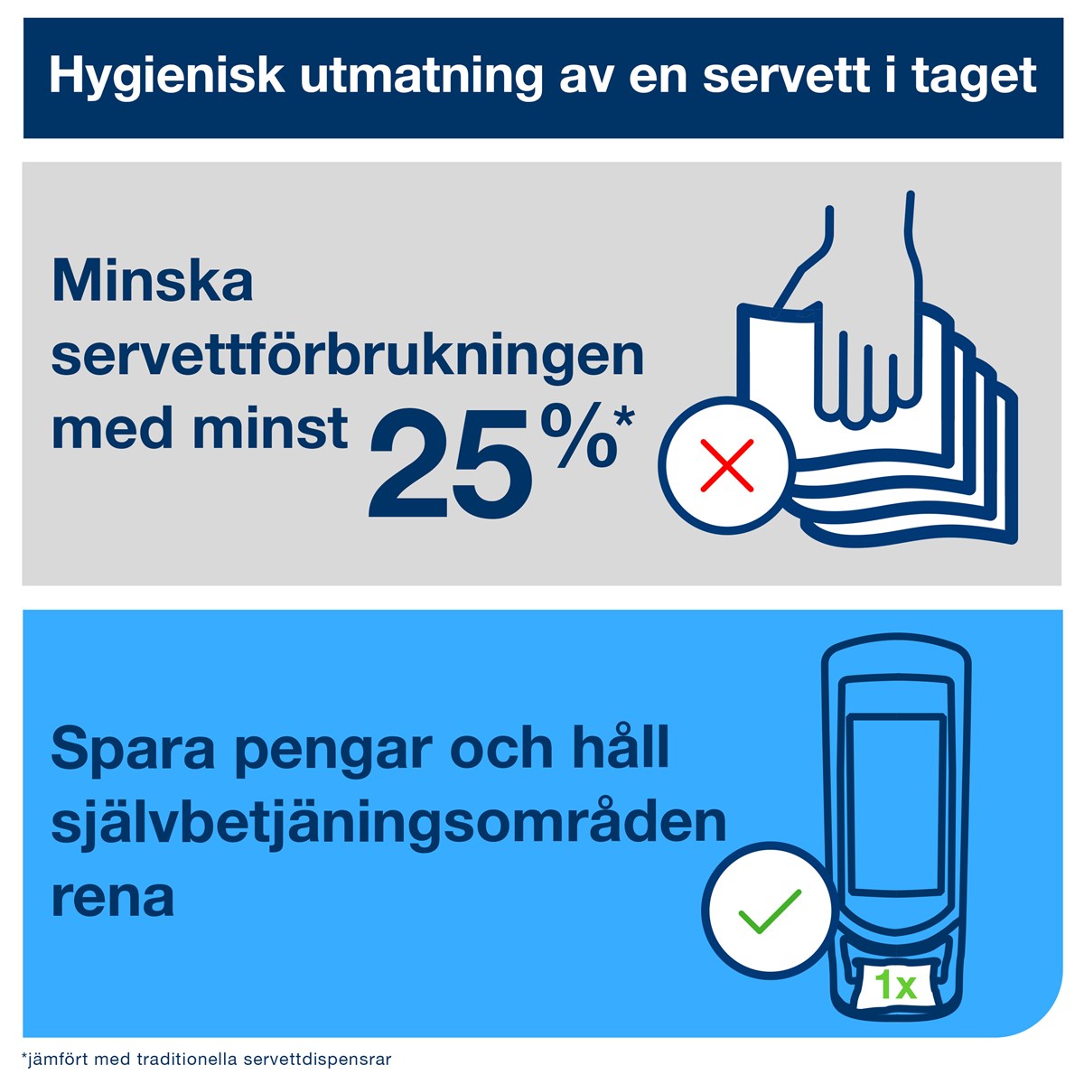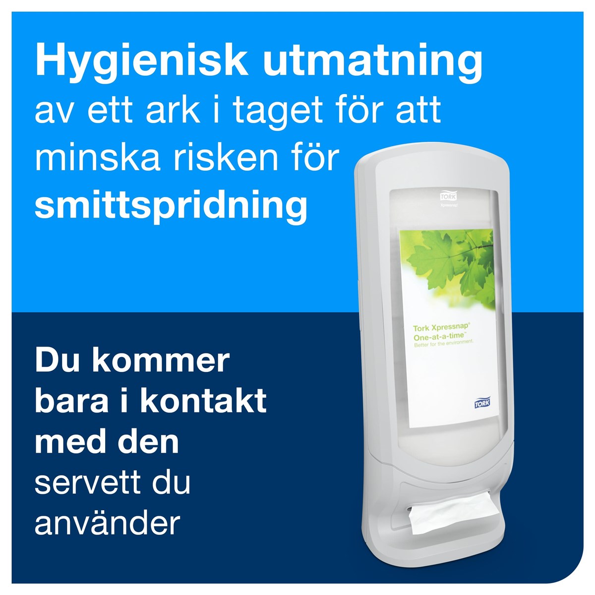 Stående servettdispenser som också kan hängas på väggen. Placera eget budskap i reklamrutan. Hög kapacitet – rymmer 1100 N4-servetter. Format: H62,2 x B23,5 x D23,5 cm.
