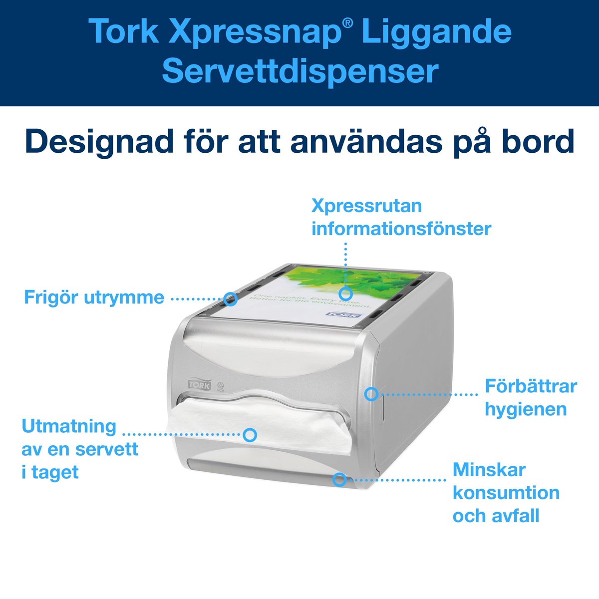 Liggande servettdispenser som kan staplas ovanpå varandra. Placera eget budskap i reklamrutan. Rymmer 550 st N4-servetter. Format: H14,5 x B19,1 x D30,5 cm.