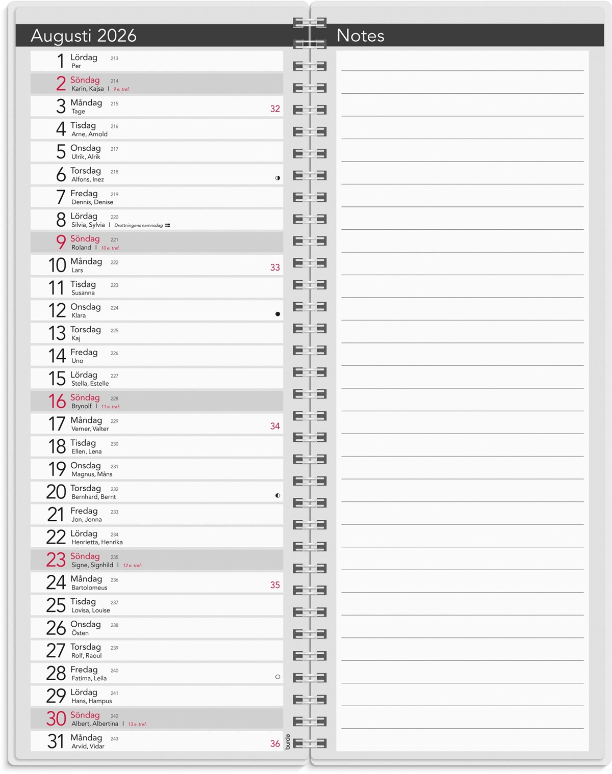 Format: 115x295 mm. Layout: Månad/blad. Kalendarium: 2026-01-01 - 2026-12-31. Omslag: PP-plast. Spiralbunden. Innehåll: Kyrkliga helgdagar, Flaggdagar, Helgdagar/aftnar, Linjerade högersidor, Månfaser, Namnsdagar, Temadagar/händelser, Årsöversikt/årsöversikter. Antal sidor: 25. Miljöinformation: FSC®.