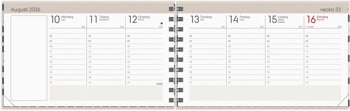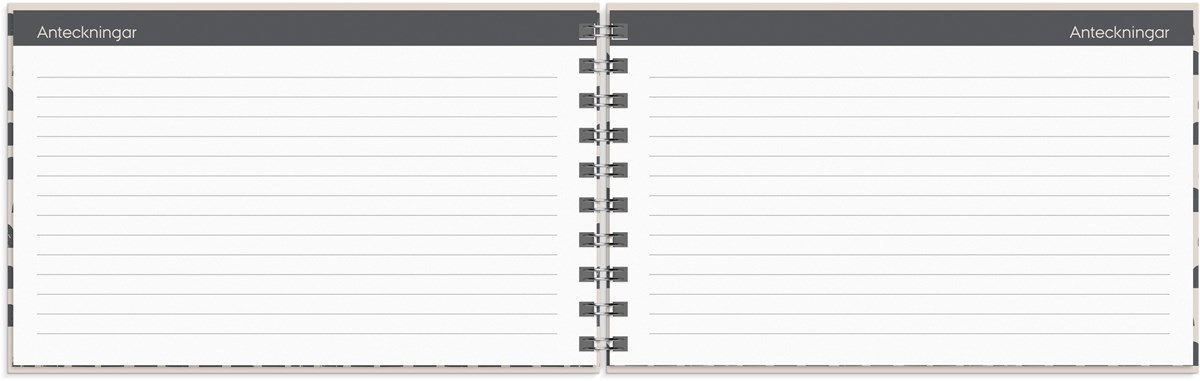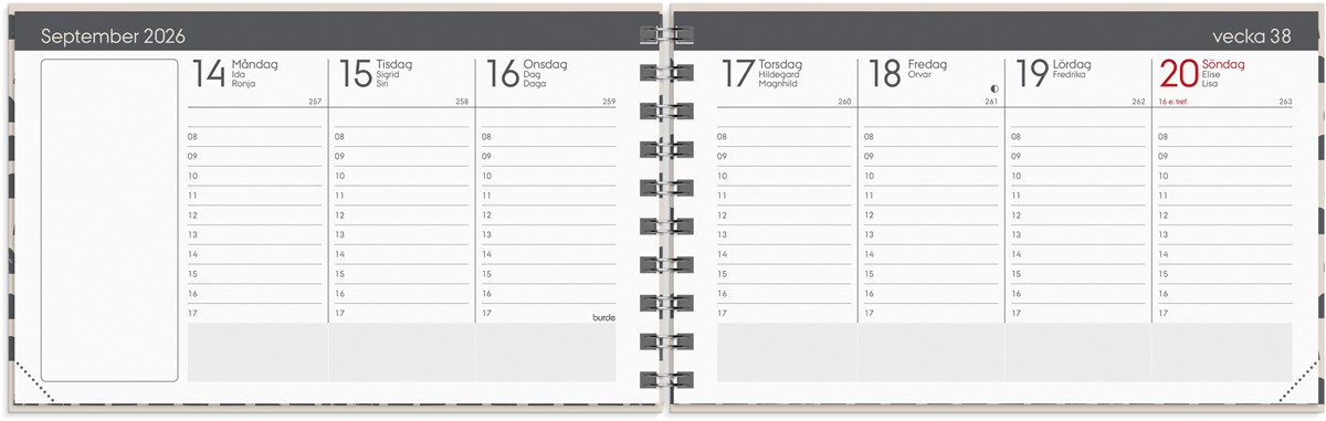 Format: 148x90 mm. Layout: Stående. Vecka/uppslag. Timindelning 8-17. Kalendarium: 2025-12-15 - 2027-01-03. Omslag: Kartong med struktur. Spiralbunden. Innehåll: Kyrkliga helgdagar, Flaggdagar, Helgdagar/aftnar, Månfaser, Namnsdagar, Internationella helgdagar översikt, Telefonregister, Temadagar/händelser, Årsplan/årsplaner. Antal sidor: 144. Miljöinformation: FSC®.
