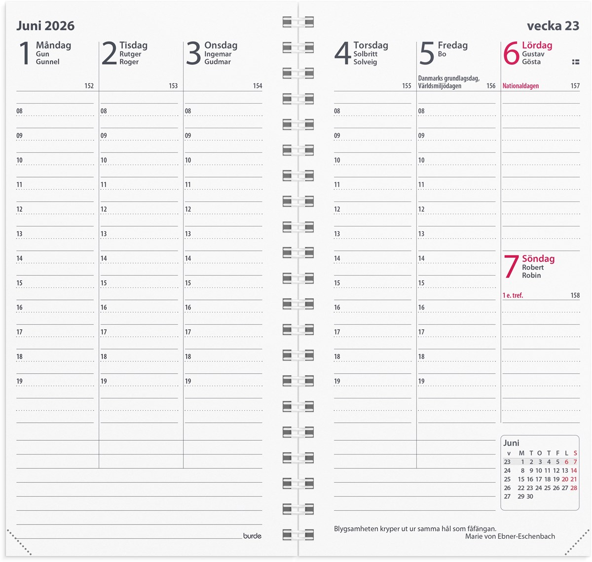 Format: 83x158 mm. Layout: Stående. Vecka/uppslag. Timindelning 8-19. Kalendarium: 2025-09-15 - 2027-03-14. Omslag: Kartong. Spiralbunden. Innehåll: Kyrkliga helgdagar, Flaggdagar, Helgdagar/aftnar, Månfaser, Namnsdagar, Internationella helgdagar översikt, Temadagar/händelser, Årsöversikt/årsöversikter, Årsplan/årsplaner. Antal sidor: 160. Miljöinformation: FSC®.