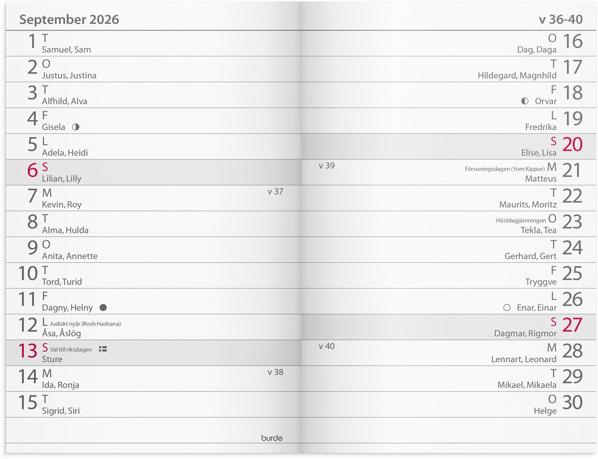 Format: 67x105 mm. Layout: Liggande. Månad/uppslag. Kalendarium: 2026-01-01 - 2026-12-31. Omslag: Kartong. Häftklamrad. Innehåll: Flaggdagar, Helgdagar/aftnar, Månfaser, Namnsdagar, Temadagar/händelser, Årsöversikt/årsöversikter. Antal sidor: 32. Miljöinformation: FSC®.