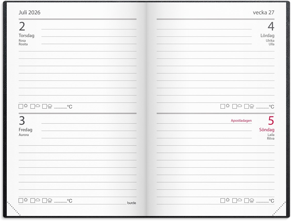 Format: 83x127 mm. Layout: Liggande. Halv vecka/uppslag. Kalendarium: 2025-12-22 - 2027-01-03. Omslag: Konstläder. Inbunden. Innehåll: Kyrkliga helgdagar, Flaggdagar, Helgdagar/aftnar, Månfaser, Namnsdagar, Anteckningssidor, Internationella helgdagar översikt, Temadagar/händelser, Årsöversikt/årsöversikter, Årsplan/årsplaner. Antal sidor: 256. Miljöinformation: FSC® papper.