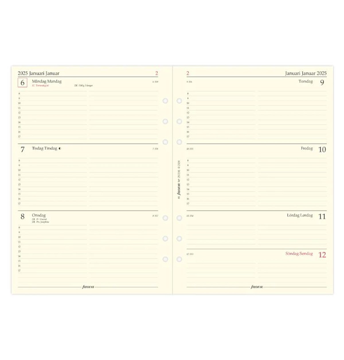 För veckoplanering med en vecka per uppslag. Trespråkig, svenska, danska och norska. Crémefärgat papper.