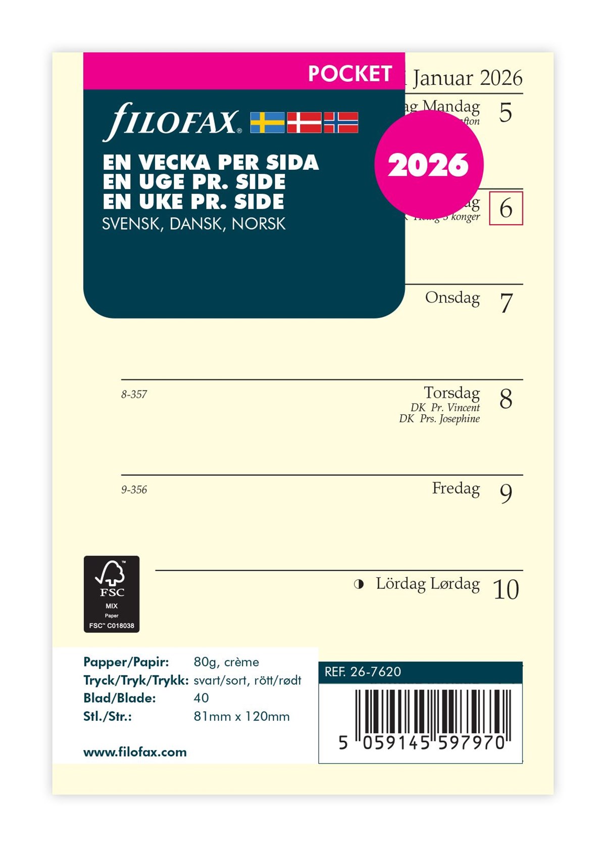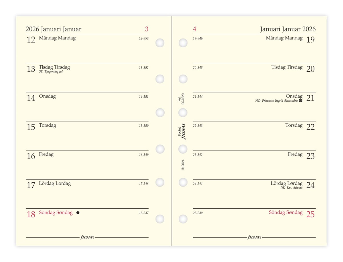 Tunn dagbok med en vecka per sida, två veckor per uppslag. 3-språkig (svenska, danska och norska).