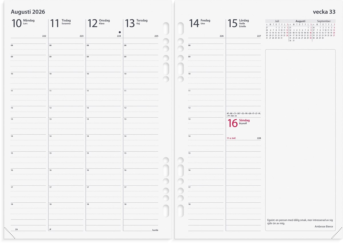 Systemkalender med grundsats. Grundsatsen innehåller hålad kalenderdel (4801) och blankettdel. Pärmen har ringmekanism (Ø 30 mm), fem kreditkortsfickor, stort myntfack med dragkedja, fack för kvitton o dyl och pennhållare. Format pärm: 185x235 mm (A5).