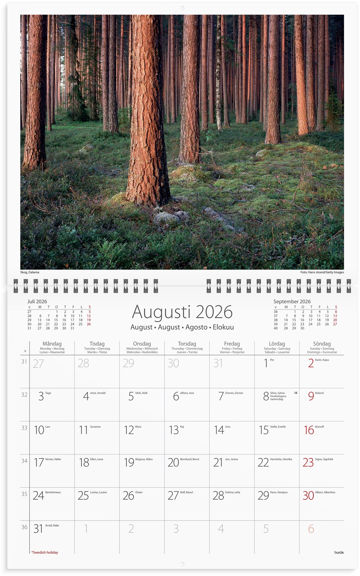 Väggkalender för överskådlig planering. Vår vackra skog visar en månad per uppslag med tolv ackompanjerande bilder av den svenska skogen och dess djurliv. Kalendern är femspråkig (svenska, engelska, tyska, spanska och finska).