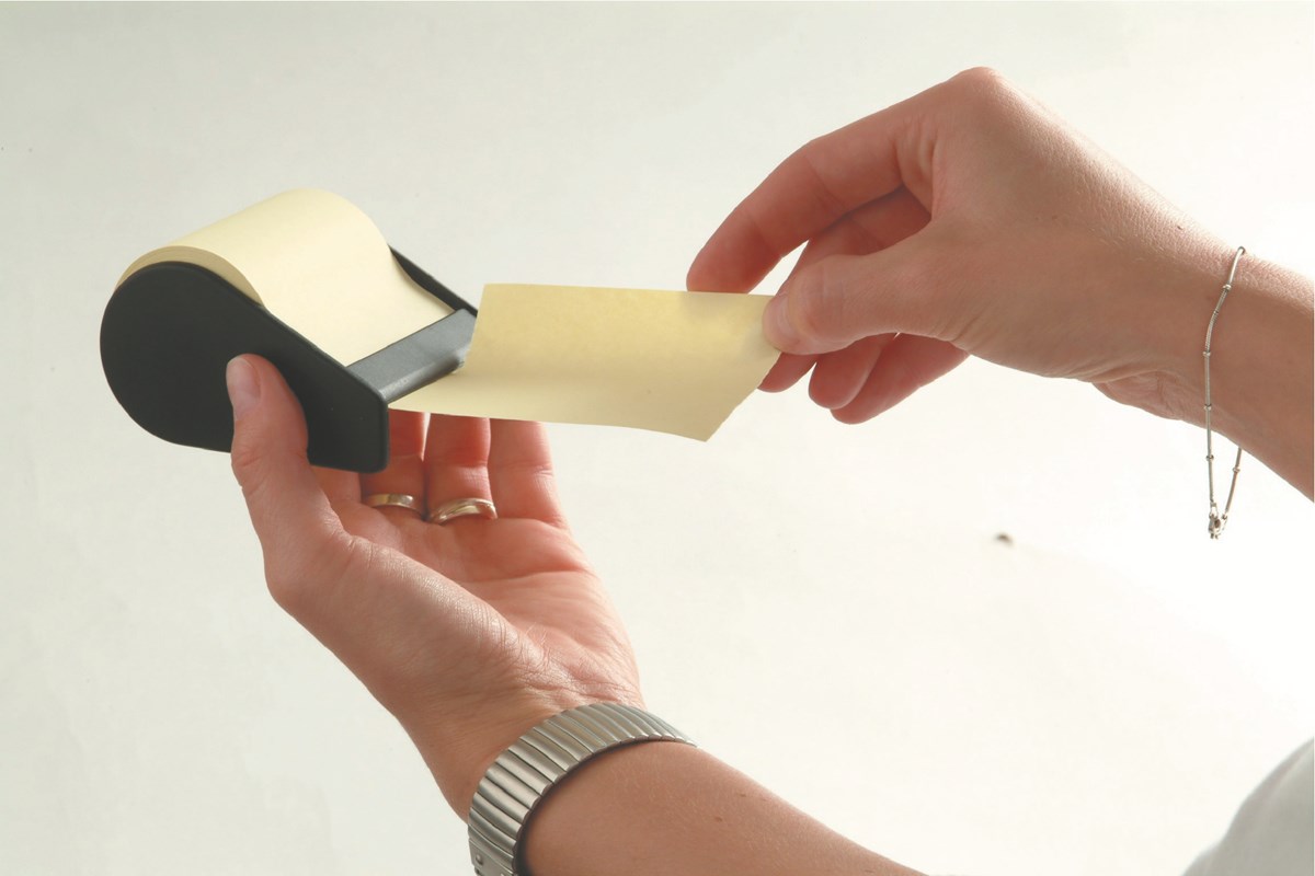 Gula noteringslappar på rulle i en liten minidispenser. Icke permanent klister på baksidan. Flyttbar.