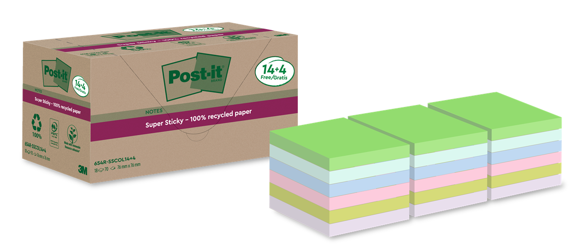 Post-it® Recycled Super Sticky Notes är tillverkade av 100 % återvunnet papper och är återvinningsbara. Dessa självhäftande notes är perfekta för att göra anteckningar eller lämna meddelanden och påminnelser på. De är perfekta för vertikala och ojämna ytor så att du kan fästa dem där du behöver dem. Super Sticky Notes har dubbelt så stark häftförmåga som Post-it® Original Notes, så du kan vara säker på att ditt meddelande sitter kvar. Tillverkas av PEFC-certifierade pappersfibrer, som kommer från hållbart skogsbruk och kontrollerade resurser. De har ett häftämne som tillverkas av en förnybar resurs, som till 60 % kommer från en växt som växer upp igen varje år. Förpackningen tillverkad av återvunnen wellpapp kan användas för att enkelt förvara dina notes i ett skrivbord eller skåp och kan återvinnas när de inte behövs längre.