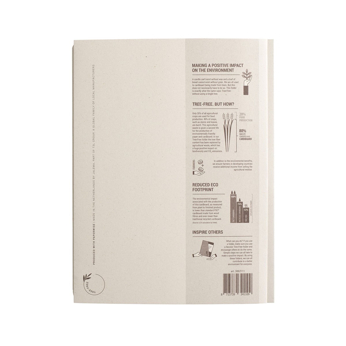 Tillsammans tar vi hand om människor och miljö! Träden får stå kvar, skörden används optimalt, jordbruksavfall får nytt liv och bönder får mer pengar för sin skörd. Jordbruksavfall förbränns oftast, vilket leder till CO2-utsläpp. Genom att istället använda jordbruksavfall till kartong får det ett andra liv, och CO2 förblir lagrad i kartongen. Miljöpåverkan av denna kartong är 47 % lägre än kartong från träd och 29 % lägre än återvunnen kartong. Genom att köpa dessa pärmar får småbönder i utvecklingsländerna inkomst inte bara för den del som blir mat (cirka 20 % av skörden), utan också för jordbruksavfallet. Inget trä används i denna kartong. Produktspecifikation: En samlingsmapp som håller ihop ett fåtal lösa dokument. Det är direkt klart vilka dokument filen innehåller. Lagringskapacitet 5 mm. Förpackad pr 10 st. Storlek: (A4) 21 x 29,7 cm.