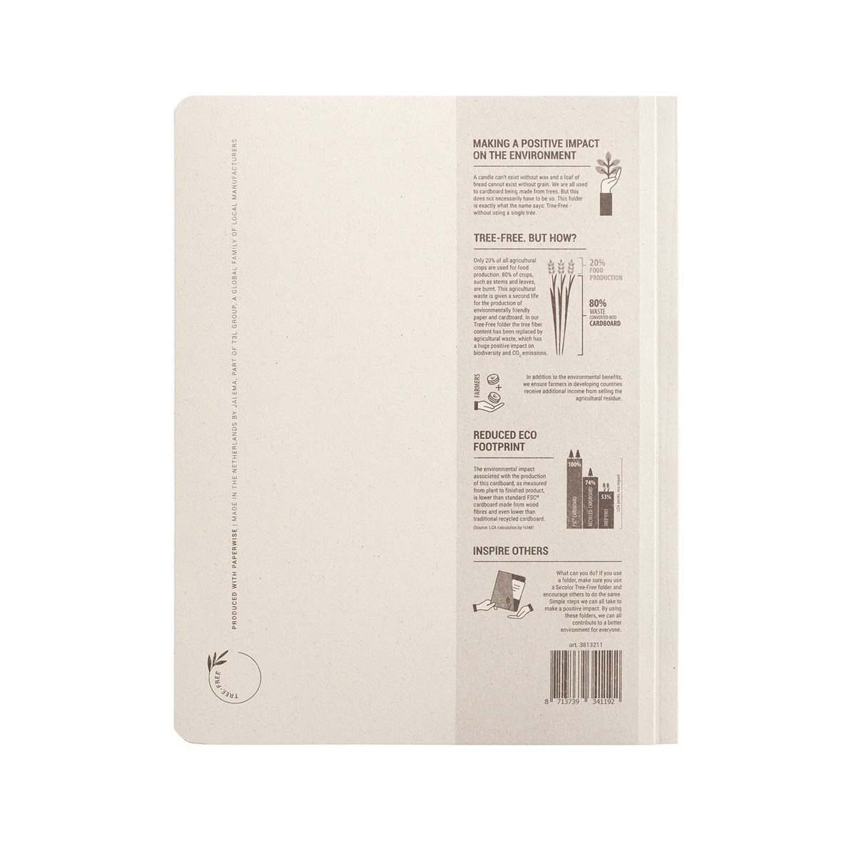Tillsammans tar vi hand om människor och miljö! Träden får stå kvar, skörden används optimalt, jordbruksavfall får nytt liv och bönder får mer pengar för sin skörd. Jordbruksavfall förbränns oftast, vilket leder till CO2-utsläpp. Genom att istället använda jordbruksavfall till kartong får det ett andra liv, och CO2 förblir lagrad i kartongen. Miljöpåverkan av denna kartong är 47 % lägre än kartong från träd och 29 % lägre än återvunnen kartong. Genom att köpa dessa pärmar får småbönder i utvecklingsländerna inkomst inte bara för den del som blir mat (cirka 20 % av skörden), utan också för jordbruksavfallet. Inget trä används i denna kartong. Produktspecifikation: Med enkel 80 mm med fäste i metall och framsida. För dokument i A4-storlek. Förpackad pr 10 st. Storlek: (A4) 21 x 29,7 cm.