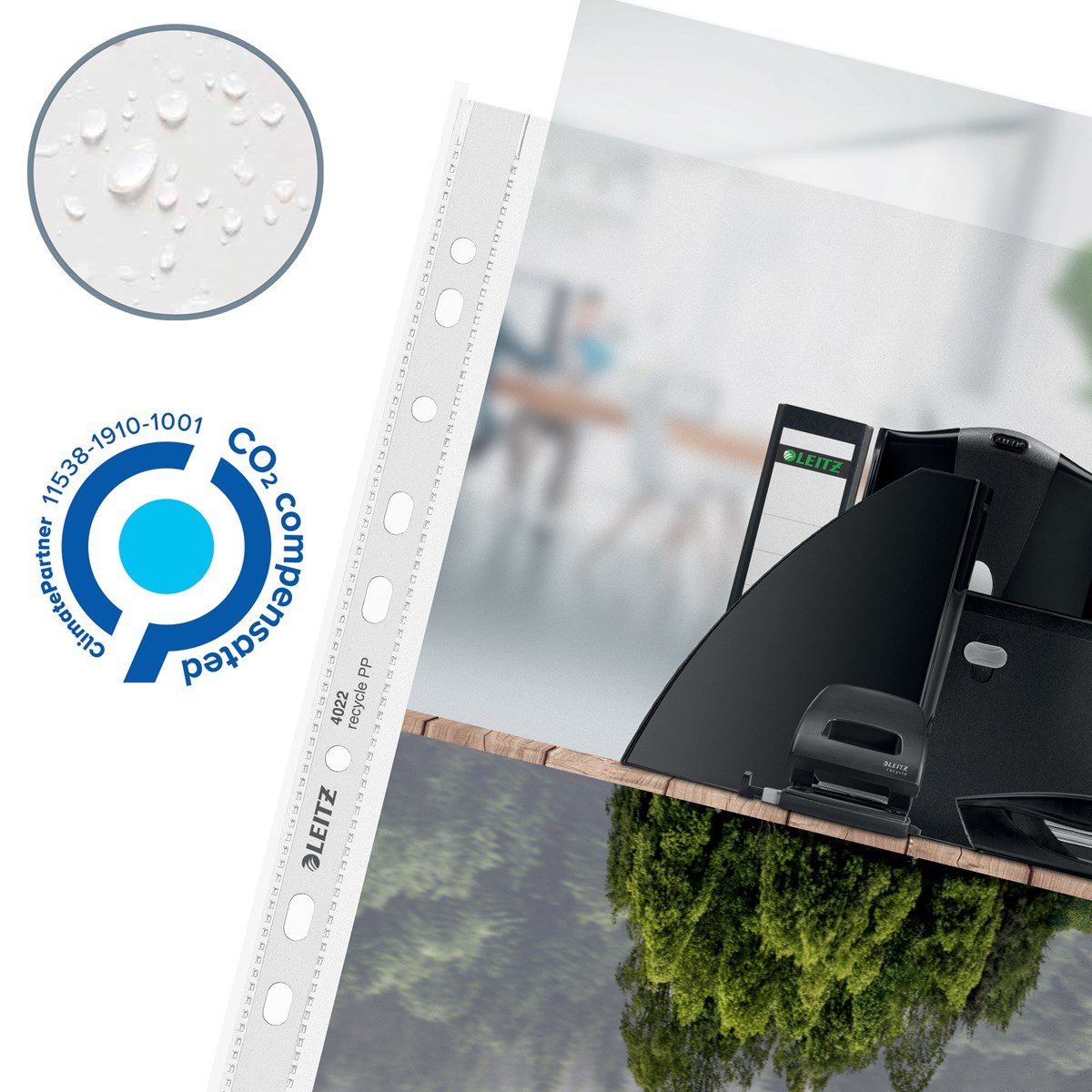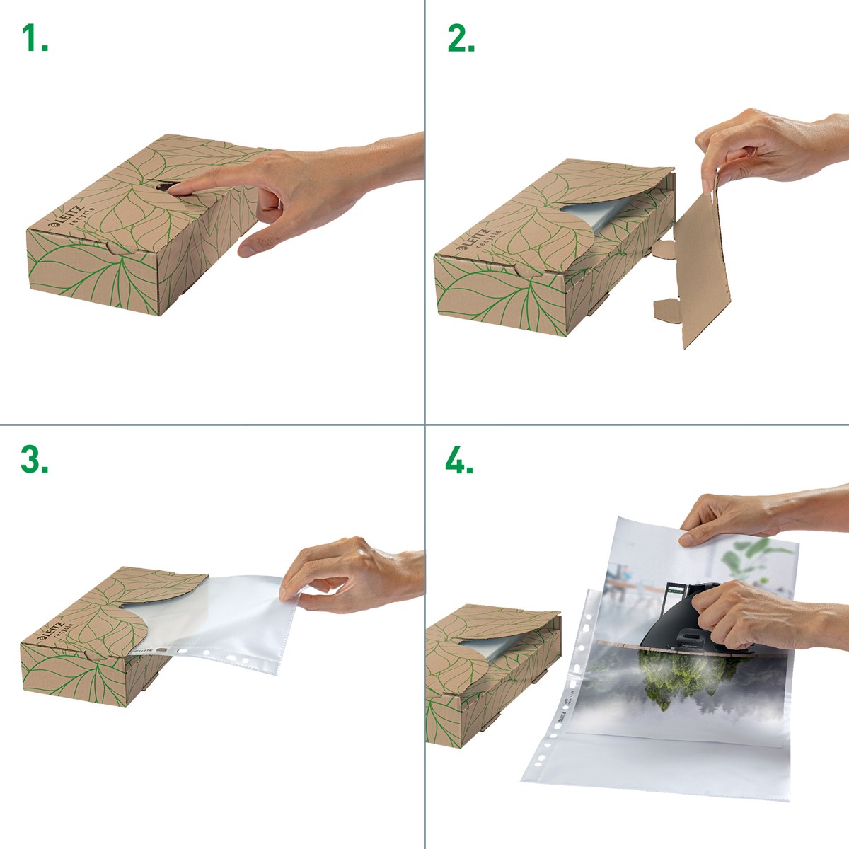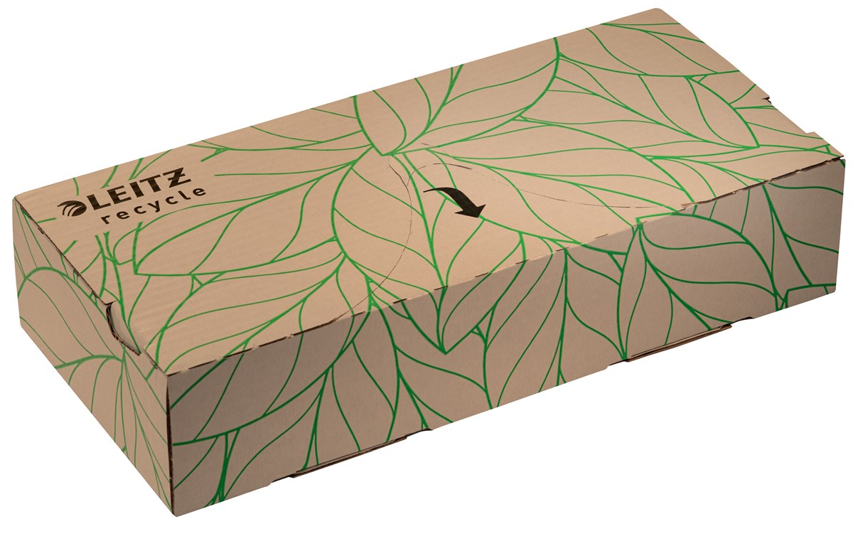 En iögonfallande dokumentficka av hög kvalitet i A4-format för att skydda dokument när du är på språng och för att organisera papper på jobbet och hemma. Den vävnadsboxliknande behållaren levererar plastfickor bekvämt en i taget. Den multiperforerade remsan gör det enkelt att förvara dokument i hävarmar och pärmar. Tillverkad av 100 % återvunnen plast (före konsumtion), externt granskad och certifierad av UL, CO2-kompenserad och 100 % återvinningsbar. Den här starka och praktiska fickan i präglad plast kompletterar perfekt andra produkter från Leitz Recycle-sortimentet och är gjord för att hålla länge. Lådan är tillverkad av 100 % kartong och är helt återvinningsbar. Moderna och samtida gröna kontorsprodukter som passar bra hemma och på kontoret. Med det miljövänliga Recycle-sortimentet från Leitz kan du både förbättra din kontorsmiljö - och miljön på vår planet.