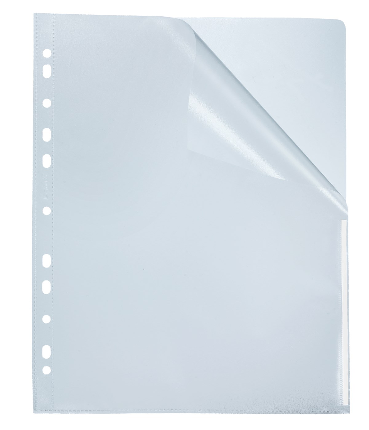 Av 0,12 mm polypropylenplast. Färgmarkerad långsida. Öppen i överkant och halva höger långsida. Universalhålning. Kopiesäker.
