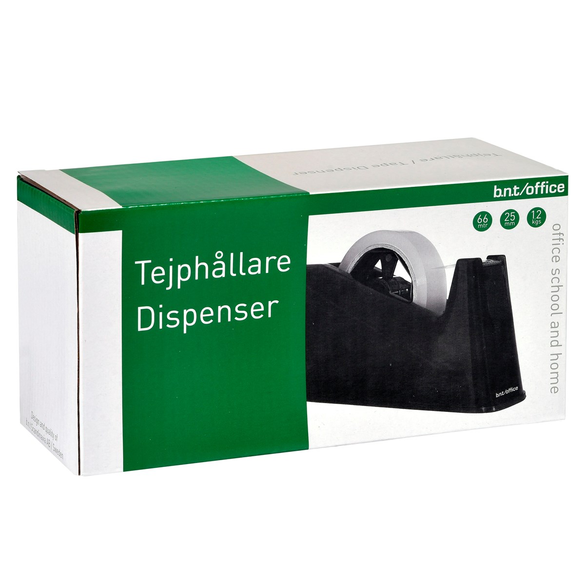 Stor tejphållare för tejprullar upp till 66 meter och 25 mm. Gedigen konstruktion i plast och metall som ger den tyngd som behövs för att hålla dispensern på plats. Med gummiplatta i botten som skonar underlaget. Vikt: 1,2 kg.