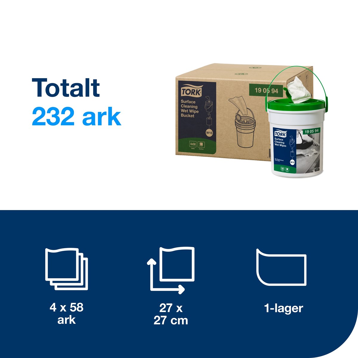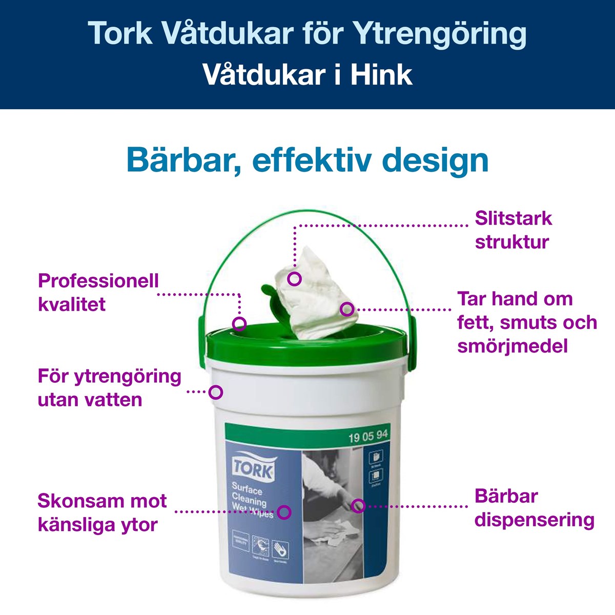 När det inte finns vatten tillgängligt men smuts måste städas undan – använd Tork Våtdukar för Ytrengöring. Dessa tåliga våtdukar är smidiga och effektiva när det kommer till rengöring av ytor och de tar snabbt bort fett, smuts, smörjmedel och olja, utan att vatten behöver användas. Med hjälp av den bärbara hinken är dessa våtdukar med professionell kvalitet alltid tillgängliga när du behöver dem. Mått: 27 x 27 cm. 58 st/hink.