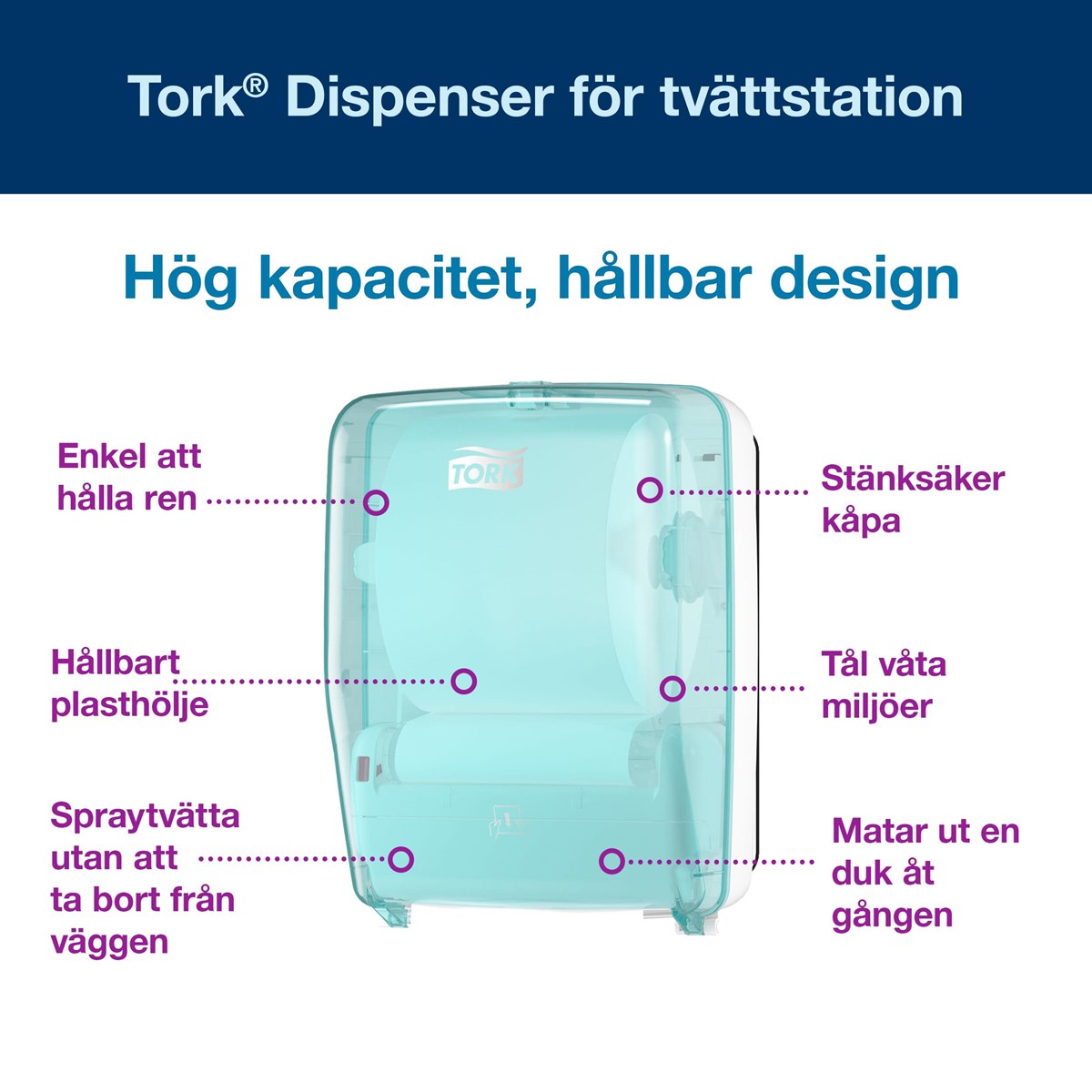 Miljöer för livsmedelsproduktion kräver bästa möjliga hygien – och det är där vår Tork Tvättstation Dispenser kommer in i bilden. Denna dispenser är utformad med sprutrengöring i åtanke. Utsidan är vattentät för att hålla avtorkningspappret rent och torrt, och förmågan att motstå våta och fuktiga förhållanden gör att delarna i rostfritt stål inte behöver bytas ut frekvent. Tiden för skötsel minskar också tack vare dispensers höga kapacitet. Design: Performance. Mått: 31,9x45,9x26,8 cm. Material: Plast. Färg: Vit/Turkos. Passar med Tork W6 refiller.