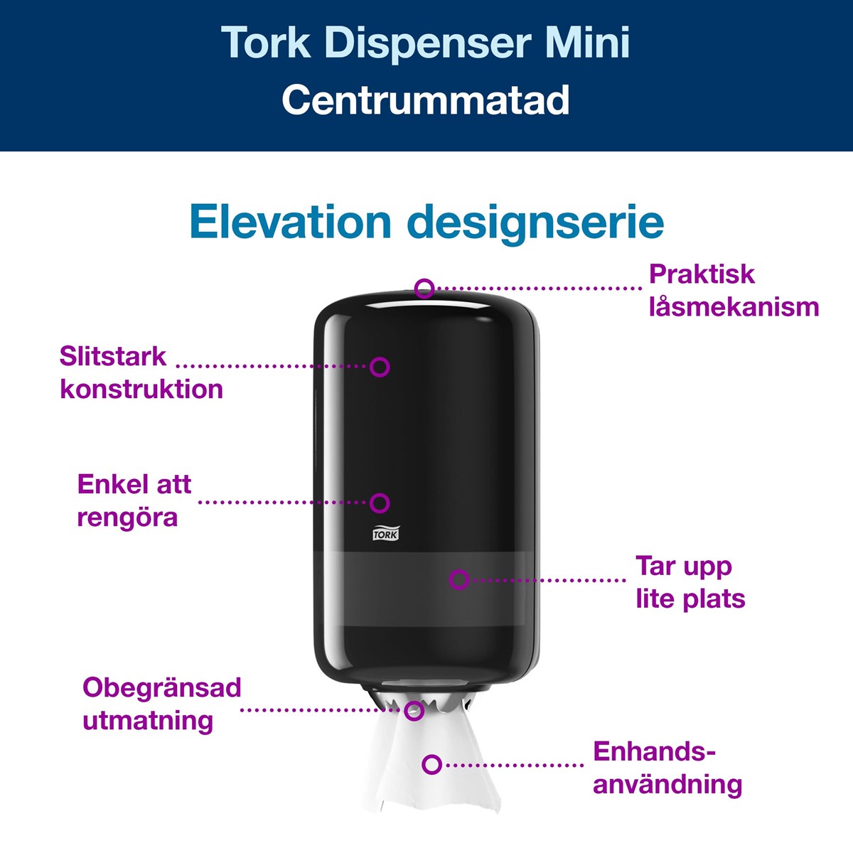Smidig hållare i plast för centrummatade Mini M1-rullar. Starka tänder i rostfritt stål. Lätt att fylla på. Mått: (H x B x D) 32 x 17,4 x 16,5 cm.