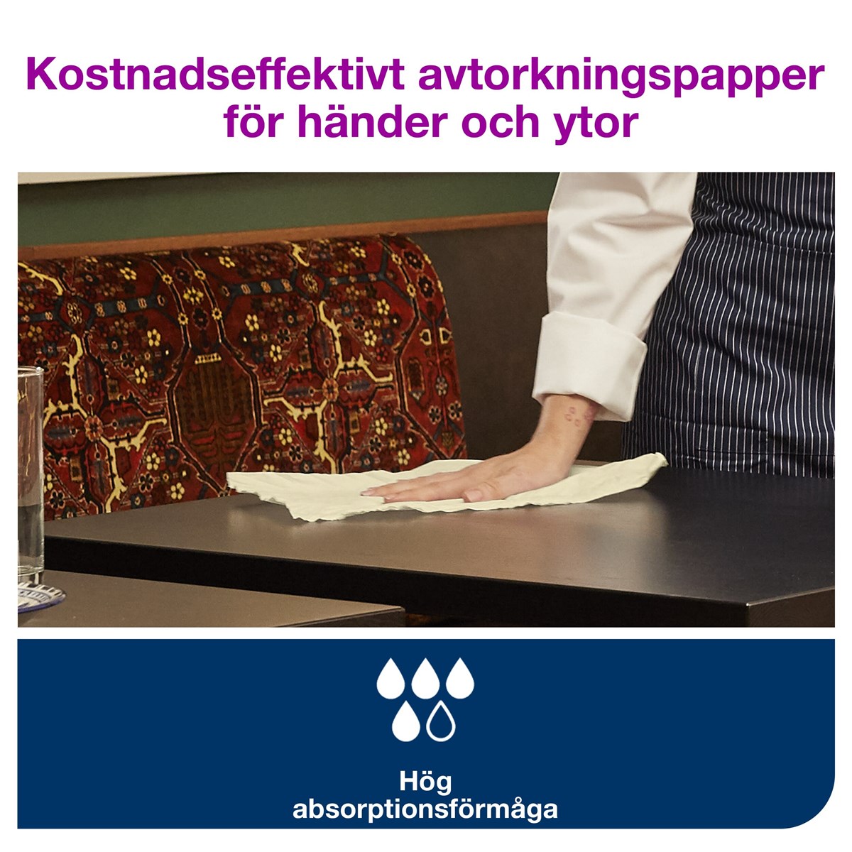 Perforerat, centrummatat gult papper. Matar ut ett papper i taget – minskar förbrukningen med upp till 37 %. Passar perfekt för lättare avtorkning och för handavtorkning. Har slutindikator – När det är 4 m papper kvar, syns blå linjer som talar om att det är dags att byta rulle. Godkänt för livsmedelskontakt. 1-lags, 857 ark. 300 m x 20,5 cm. 6 rullar/förp.