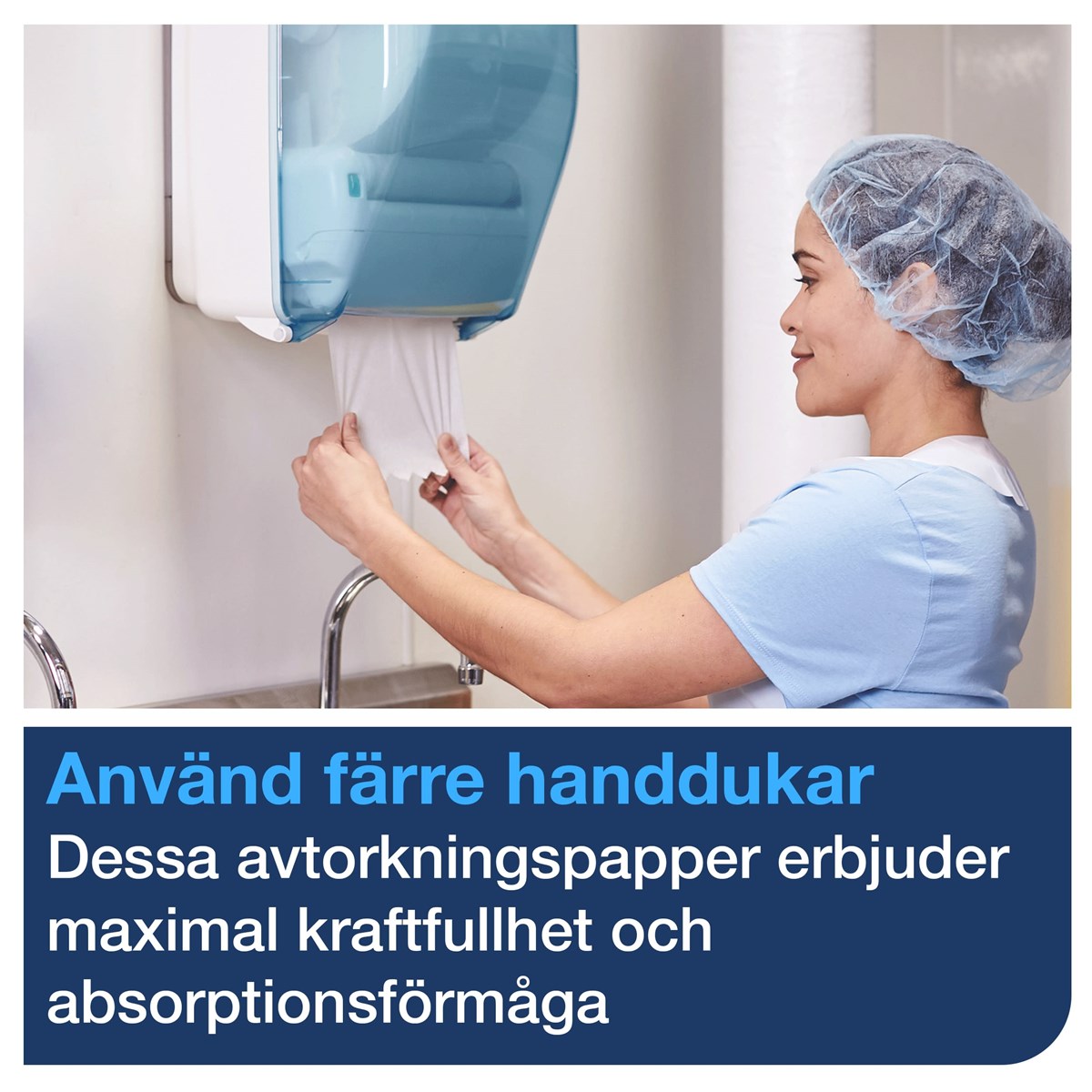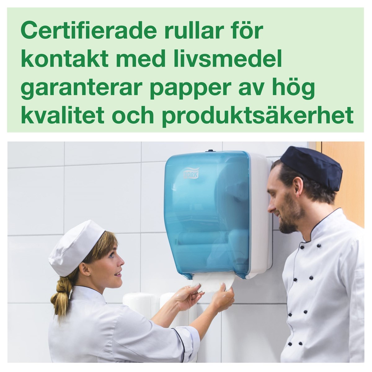 Tork avtorkningspapper är designat för bästa möjliga utmatning från systemet Tork Dispenser Tvättstation. Produkten är certifierad med HACCP International vilket garanterar att den är säker för användning i lokaler för livsmedelsbearbetning och matberedning. Extra lång rulle för matberedningsmiljöer med stora volymer – mindre underhåll sparar tid. Pappret är utformat för våta miljöer och behåller effektiviteten i miljöer med hög fuktighet vilket säkerställer hög grad av bekvämlighet och sparar tid. Mått: 250 m x 19,5 cm/rulle.