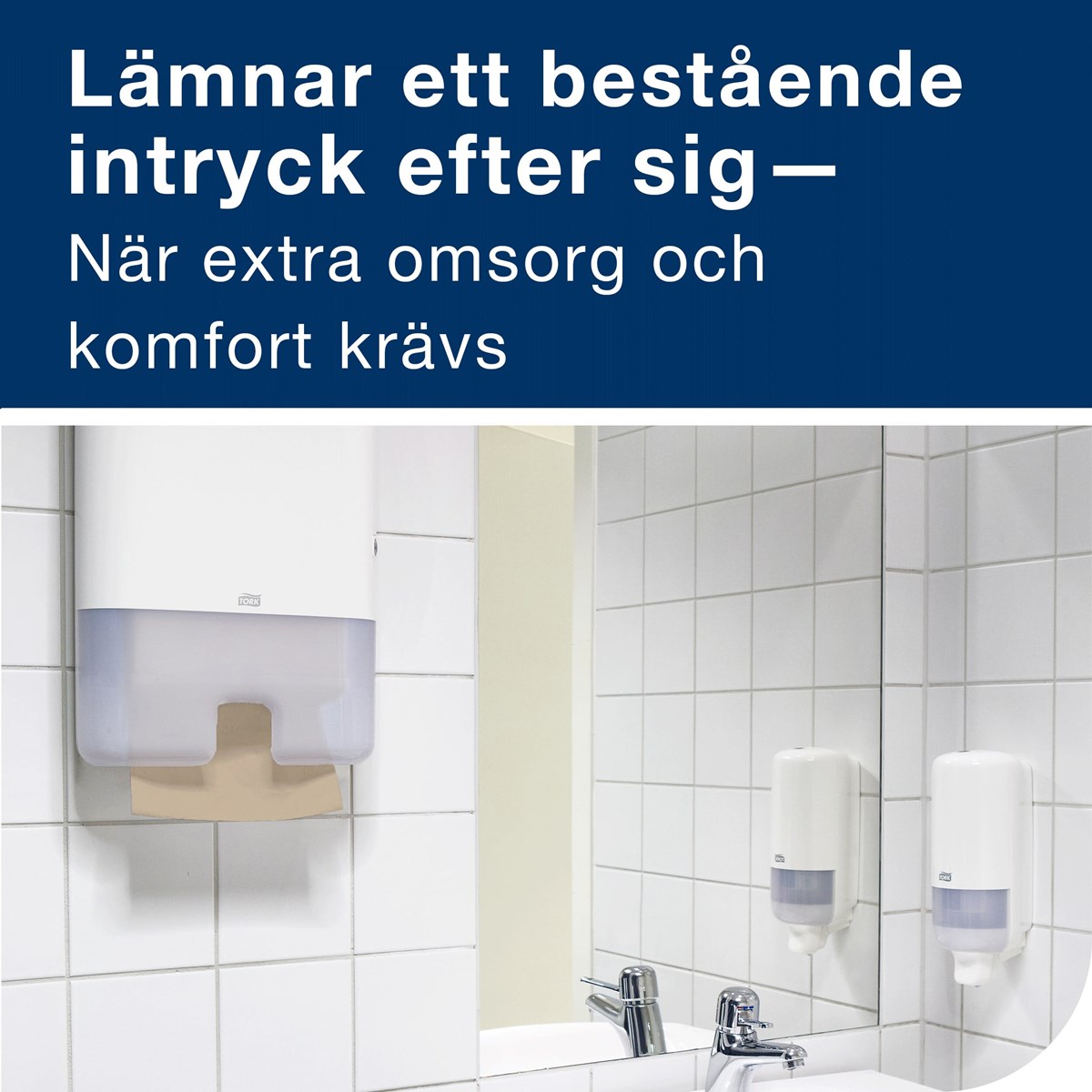 Handdukarna är skonsamma mot huden och förmedlar en känsla av hög kvalitet. Den ljusbruna färgen kommer från fibrer av återvunna kartonger. Inga färgämnen tillsätts vid tillverkningen. Kompatibel med Tork H2-dispensrar. Lämpliga för toalettutrymmen med medelhög besöksfrekvens. Dispensern får plats i små utrymmen och erbjuder dina gäster både komfort och hygien. Pappret tillverkas av 100 % återvunna fibrer. Mått: 24x21,3 cm. 180 st/bunt, 3780 st/förp.