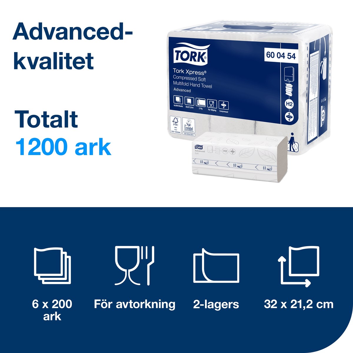6 förpackningar med 200 pappershanddukar vardera. 2-lagers. Advanced-kvalitet. Vikt storlek: 8x21,2 cm. Ovikt storlek: 32x21,2 cm. Passar med H2 dispensrar.
