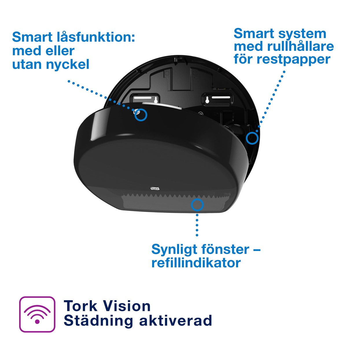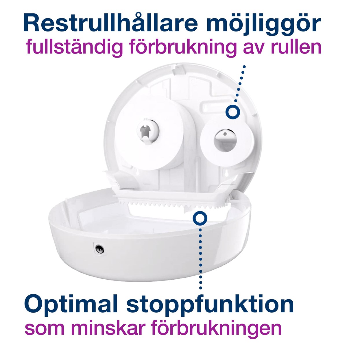Smart hållare för rullen möjliggör fullständig förbrukning av rullen och minimerar mängden avfall Med optimal rullbroms slipper du fritt roterande rullar och minskar därmed förbrukningen Genomskinligt fönster gör det möjligt att se när det är dags för påfyllning