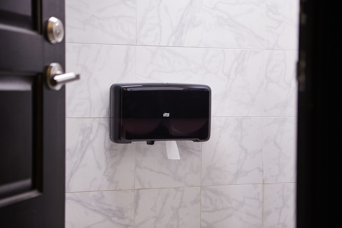 Modern hållare med hög kapacitet. För två Mini Jumbo T2-rullar. En rulle i taget används. Tillverkad i kraftig plast, låsbar. Mått: (H x B x D) 25,6 x 43,2 x 14,6 cm.