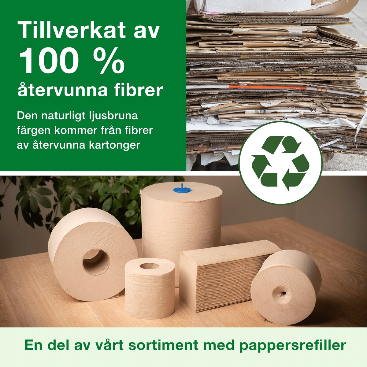 Ge gästerna samma komfort som hemma med extra långt toalettpapper i Advanced-kvalitet från Tork. Det här är ett kostnadseffektivt och funktionellt toalettpapper – perfekt för toalettutrymmen med låg besöksfrekvens. Pappret tillverkas av 100 % återvunna fibrer. Den naturligt ljusbruna färgen kommer från vår användning av återvunna kartonger som är en av fiberkällorna.